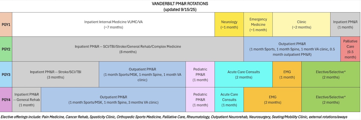 Vanderbilt University Physical Medicine & Rehabilitation residency is a four-year, categorical program. We accept four residents per year. Residents spend their first year in the Vanderbilt Internal Medicine Residency Program, while also rotating for one month in PM&R.